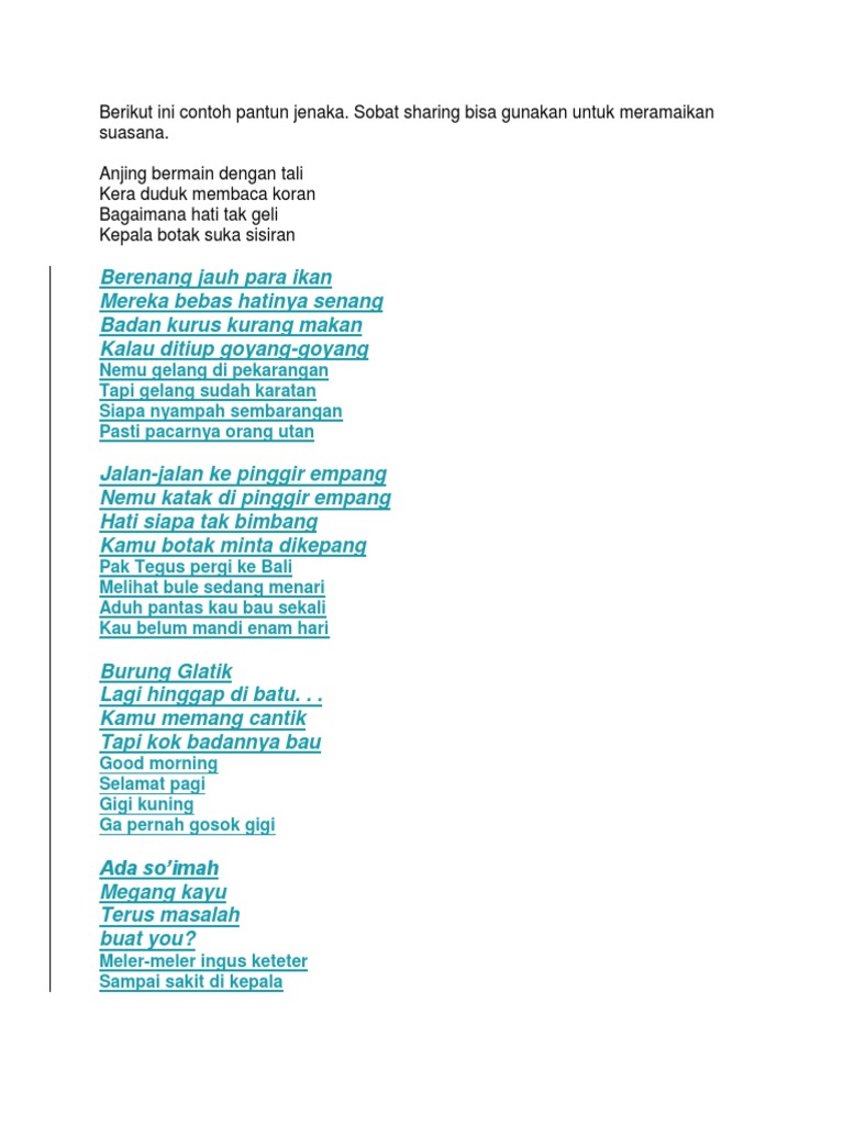 Contoh Pantun Teka Teki Lucu Beserta Jawabannya from www.yuksinau.id Check spelling or type a new query. We did not find results for: Maybe you would like to learn more about one of these?